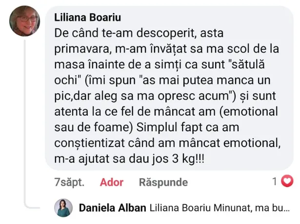 Aș vrea să îți spun că și tu poți reuși, folosind aceeași metodă. Am lucrat cu femei de toate vârstele, începând de la adolescente, până la femei pensionare, toate se luptau cu kilogramele acumulate și cu tendința de a "pansa" rănile emoționale cu mâncare.